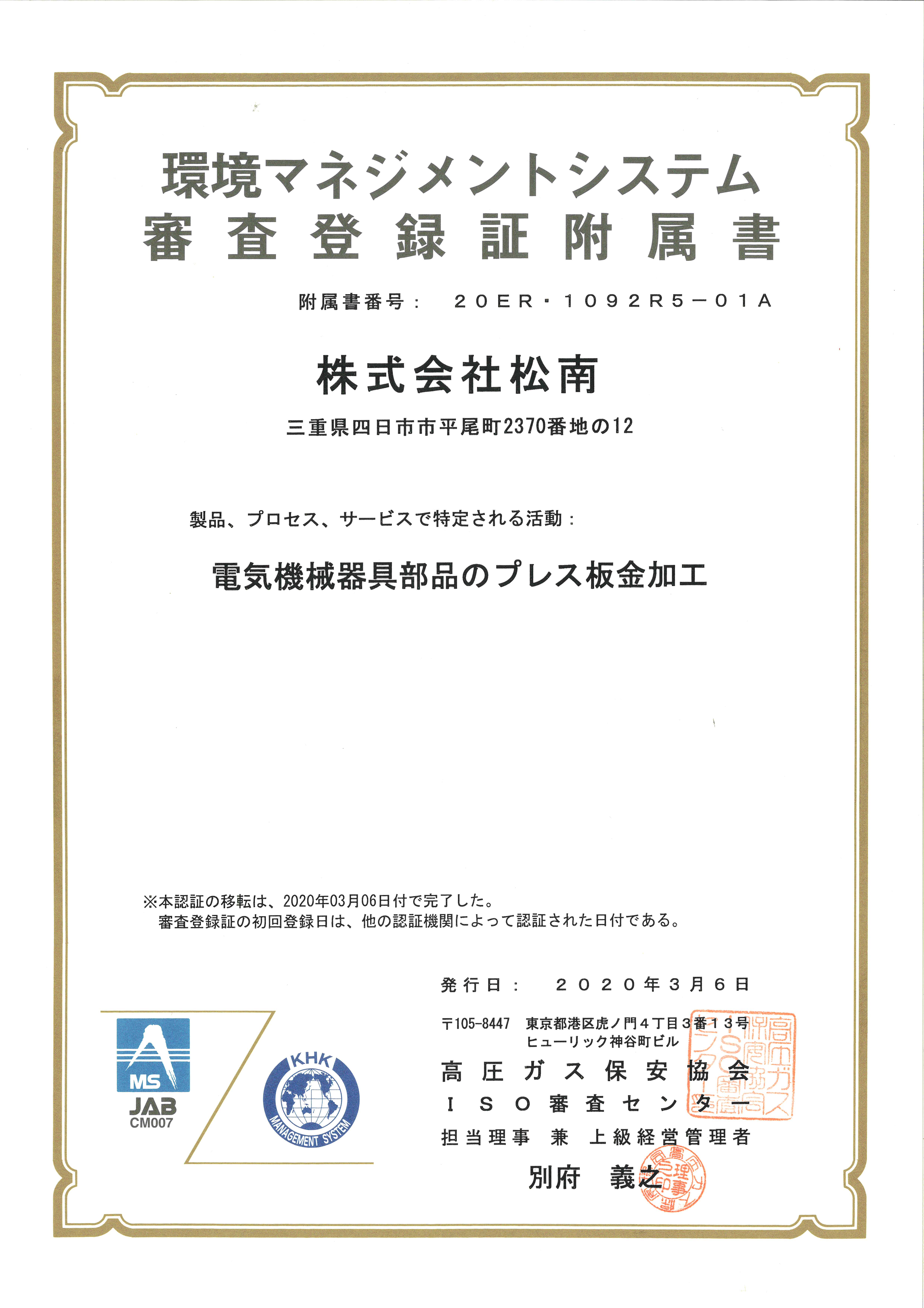 ISO14001 審査登録証附属書(KHK)20.4.1.